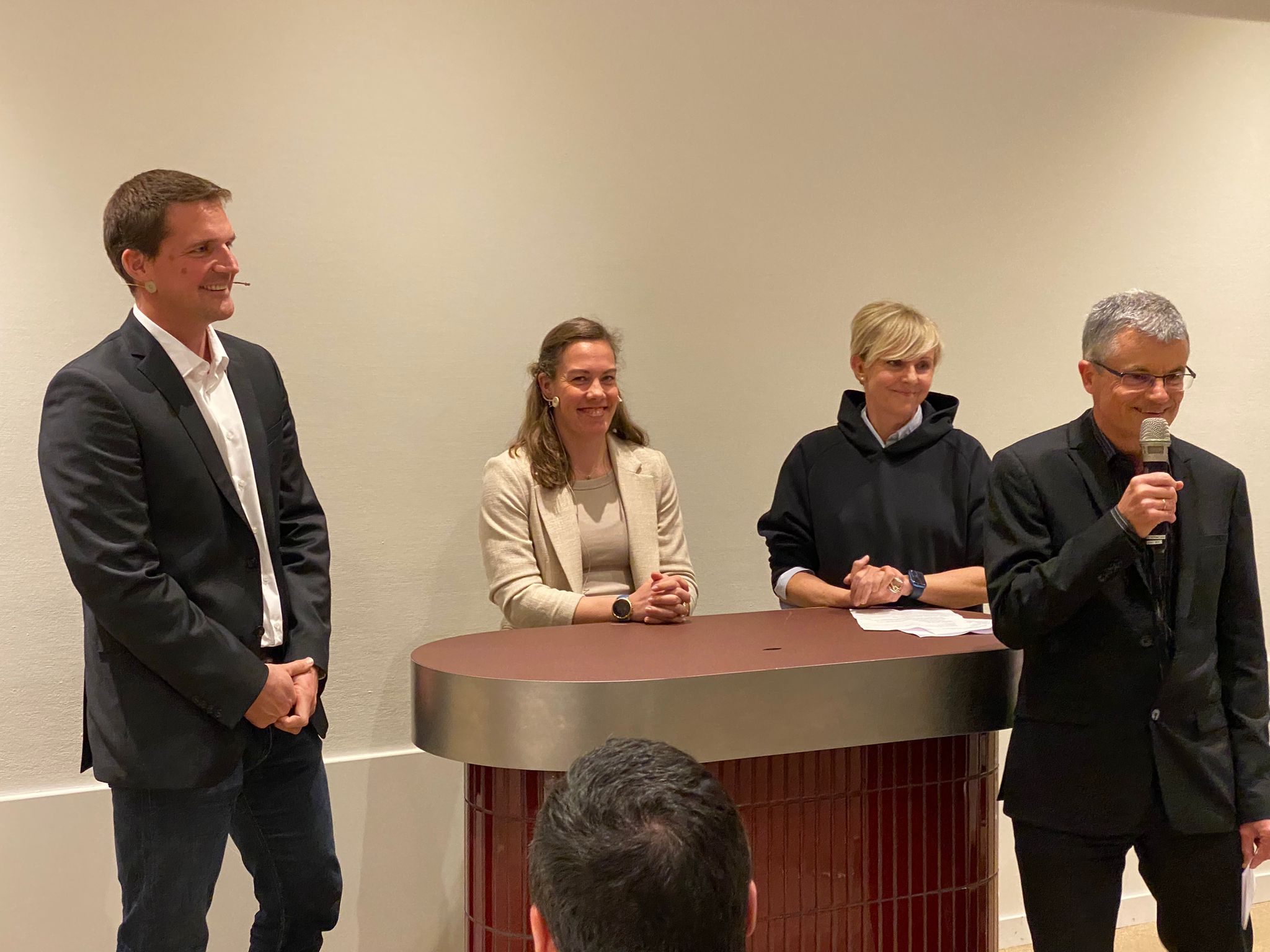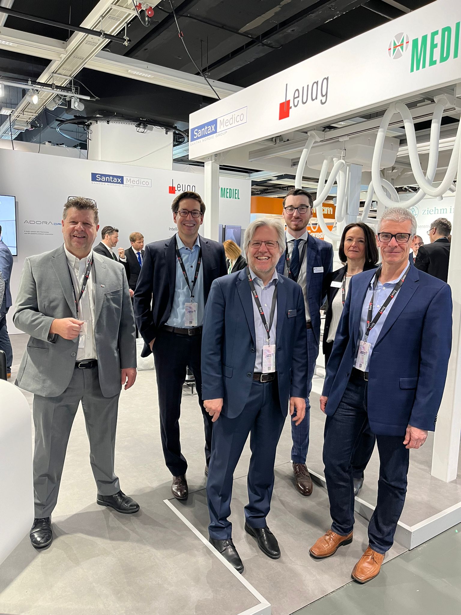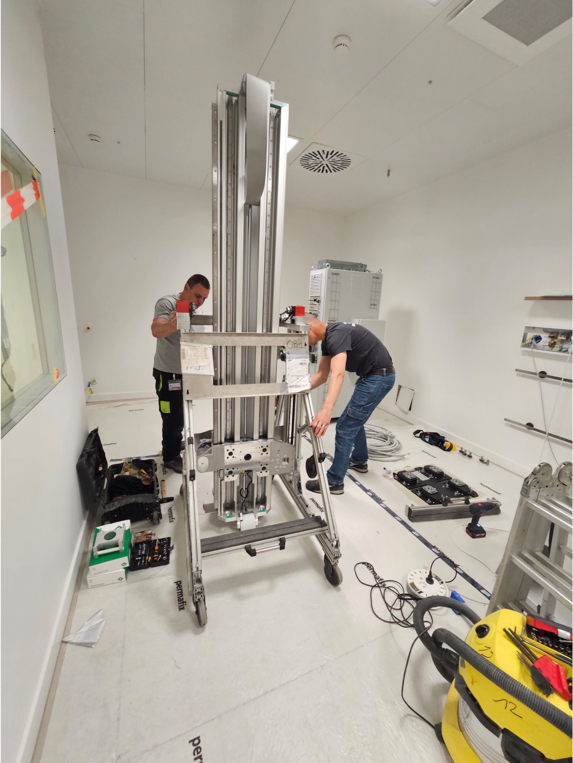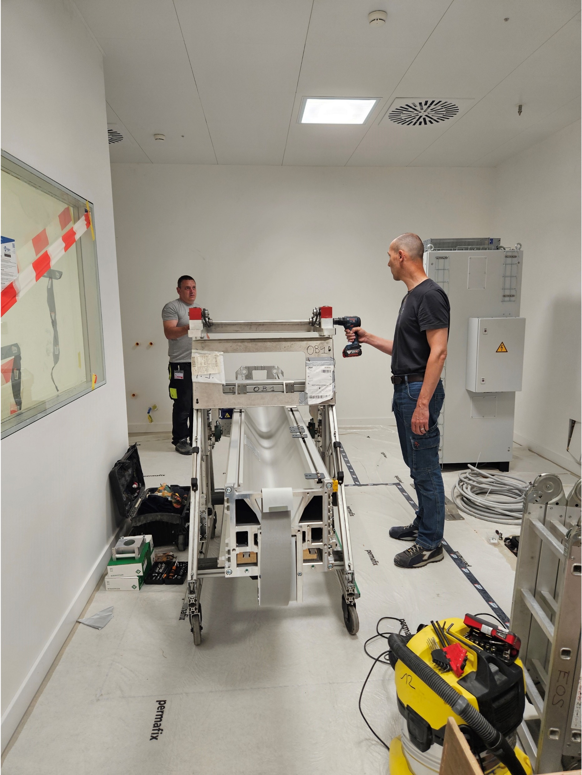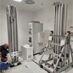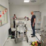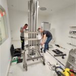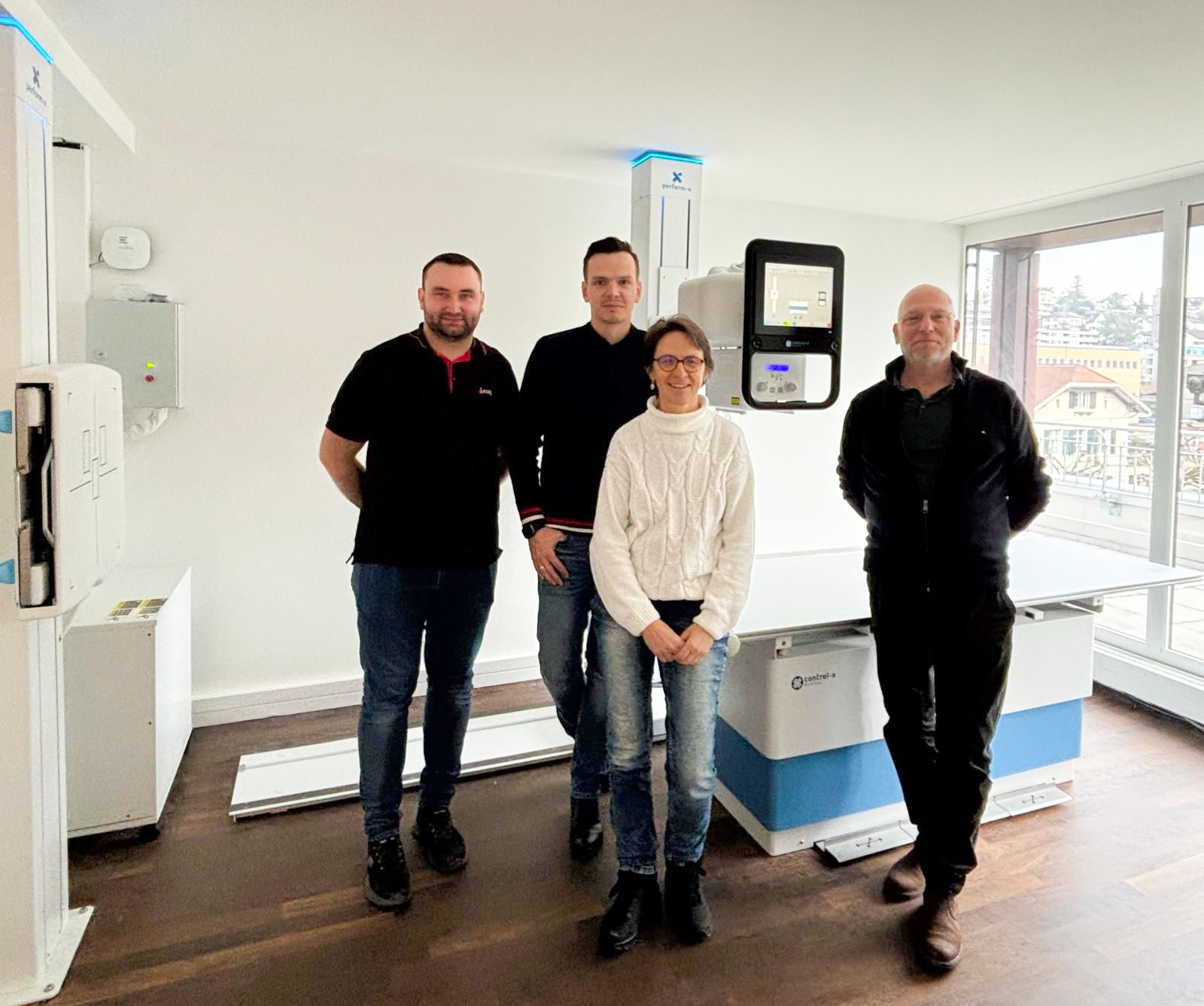 Vor der erfolgreichen Inbetriebnahme des bodenmontierten Geräts von links: Hamza Murtic (Serviceingenieur Leuag), Krisztián Vámos (Director of Operations Control-X Medical), Irene Steinmann (Applikation Leuag) und Bart van Ginkel (Technical Product Specialist Canon Medical Components).